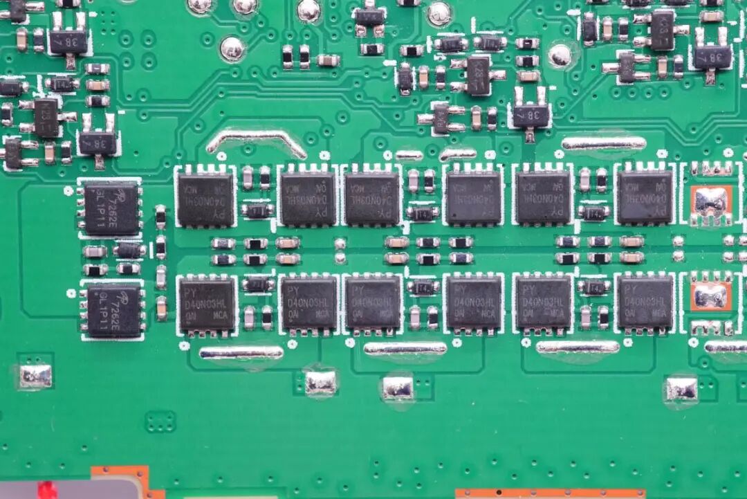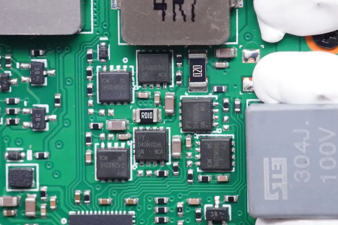 六颗MOS管均来自平伟,丝印D04N03HL,四颗用于线圈驱动,另外两颗用于同步降压电路降压输出。