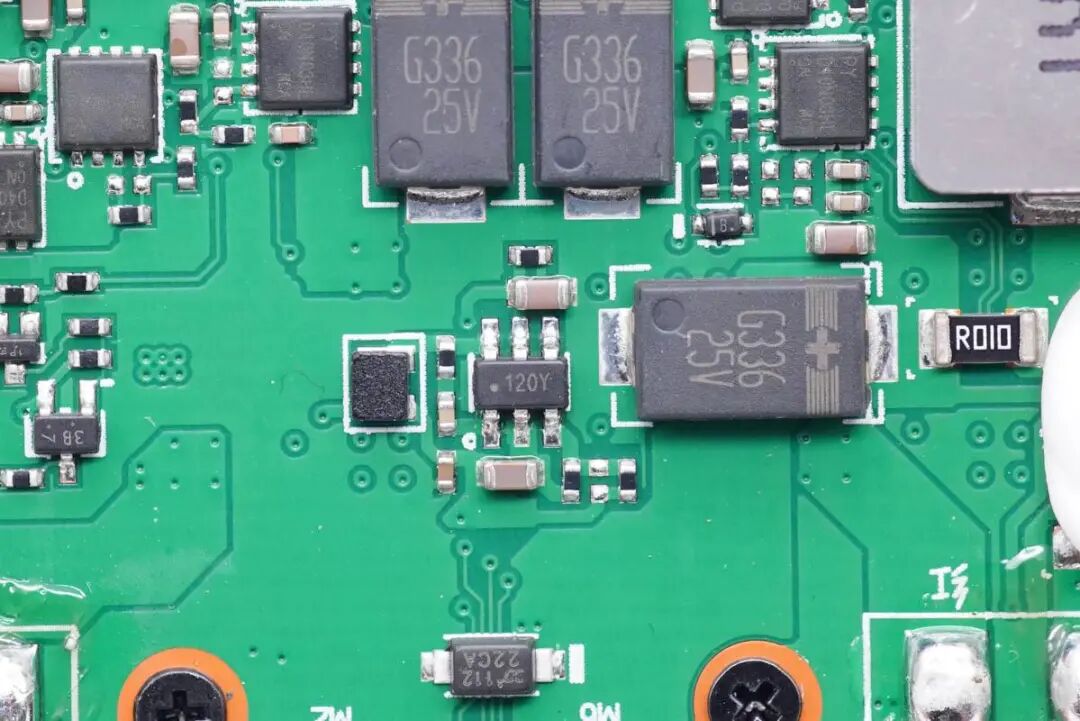 一颗丝印120Y的六脚芯片用于降压,旁边聚合物叠层电容进行输入滤波,国光品牌,规格为25V 33μF。