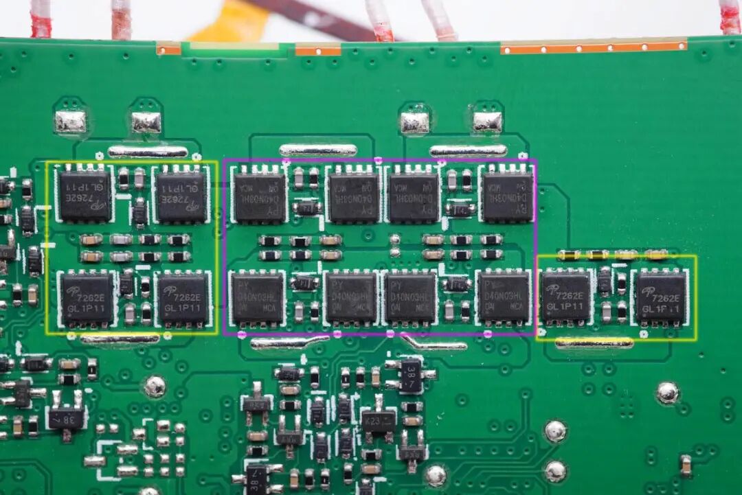 黄框MOS管,耐压60V,DFN 3x3 EP封装。紫框MOS管来自PY,丝印D04N03HL。