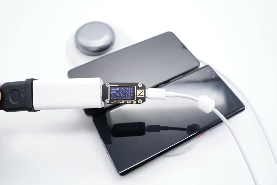 同时给华为Mate 30、Mate 40以及FreeBuds 4耳机进行无线充电,使用ChargerLAB POWER-Z KM001C测得输入功率为19.9V 1.76A 35.11W。