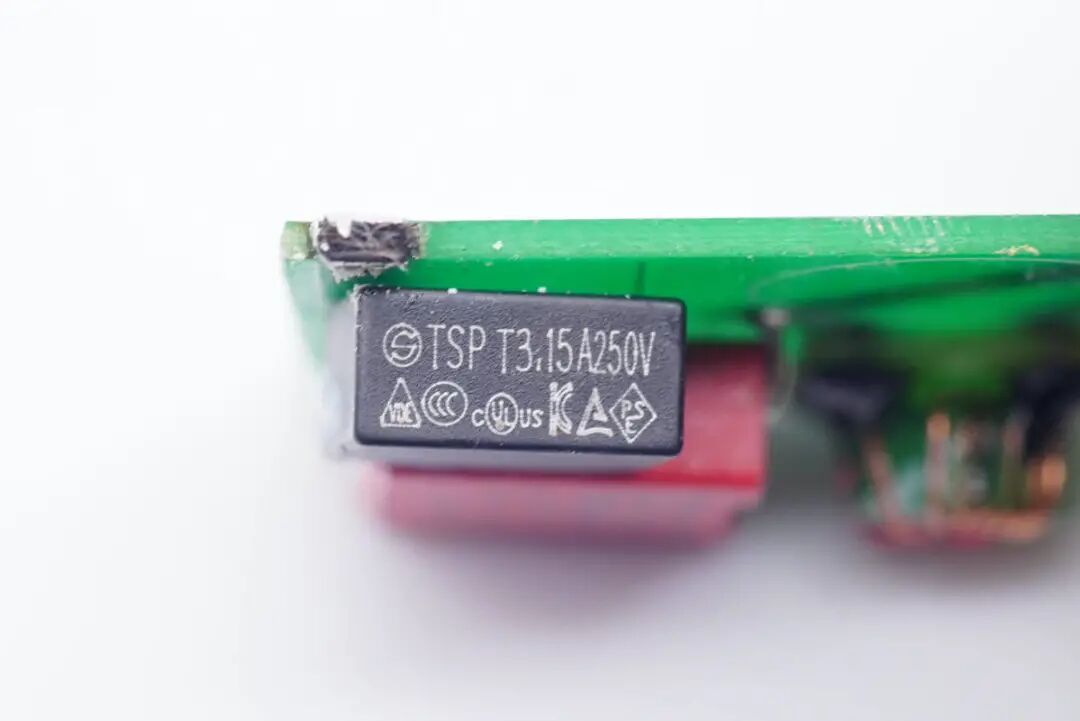 将前端小板拆下,正面设有延时保险丝、共模电感和安规X电容,左上角圆圈区域预留给焊接在主板上的滤波电感。