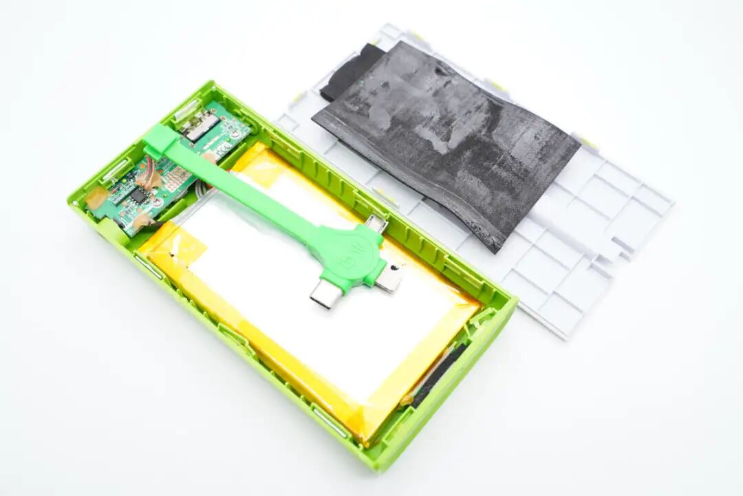 将背面外壳拆开,在外壳和电芯间置有泡棉进行缓冲保护和固定。