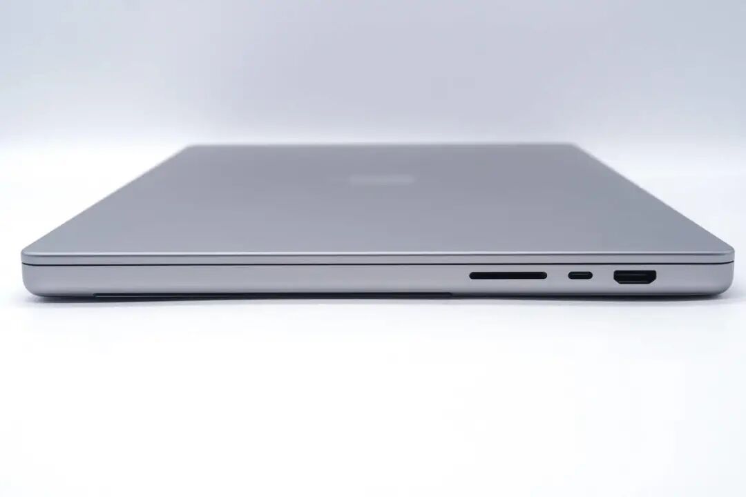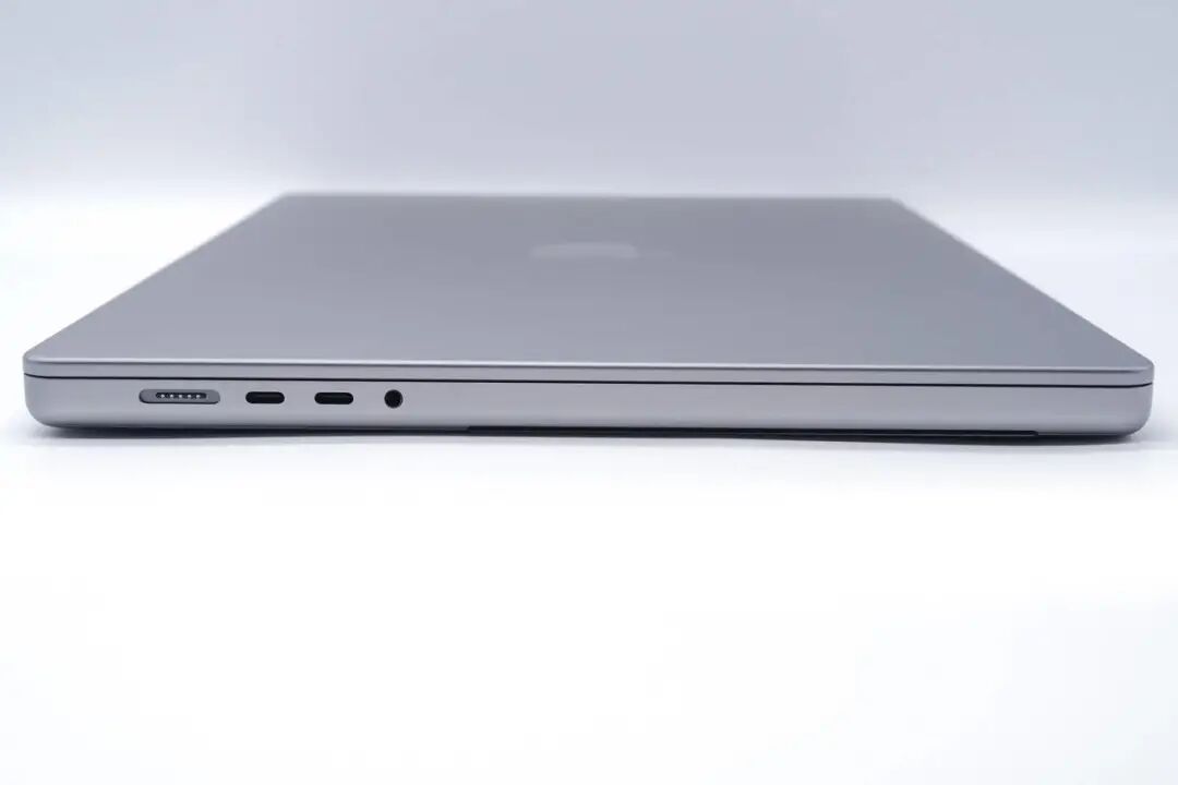此次的接口配置也是一大亮点,电脑的左侧,从左到右依次是MagSafe 3磁吸充电接口、2个雷电4接口以及3.5mm的耳机接口。