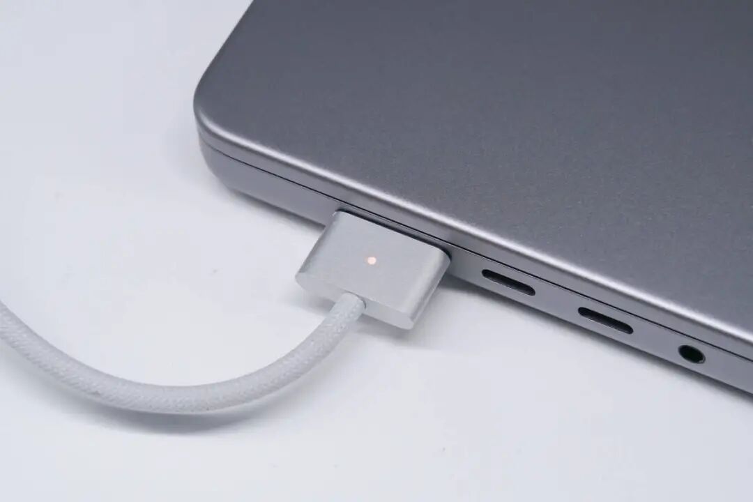 在充电时MagSafe 3磁吸接头端的指示灯呈琥珀色显示,表面此时笔记本正在充电。