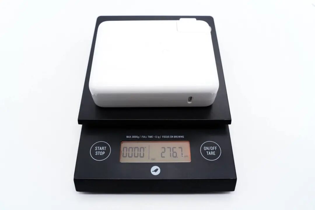 可以得出充电器的三围参数为96.13x75.17x28.68mm,充电器的体积约为207.24cm³,以最高输出140W计算,功率密度约为0.67W/cm³。
