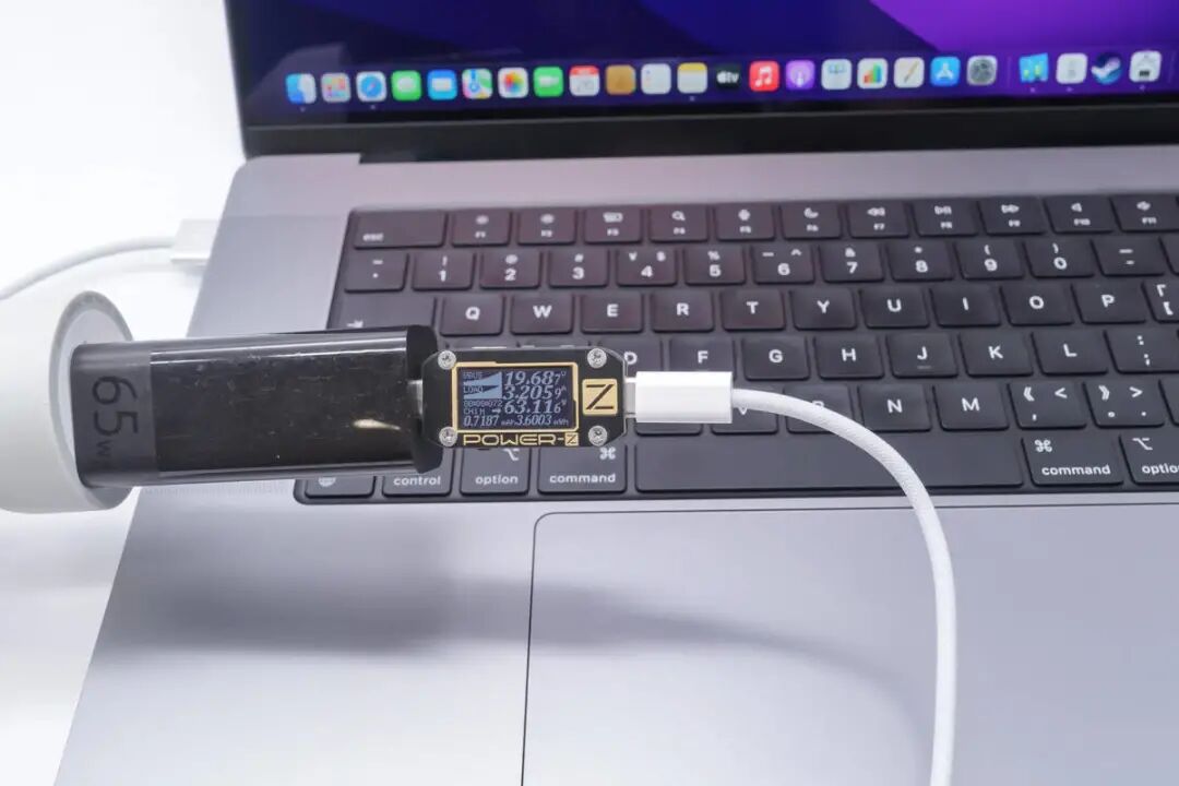 最后使用紫米65W氮化镓充电器(1C1A)为MacBook Pro 16充电,功率为19.68V 3.20A 63.11W。
