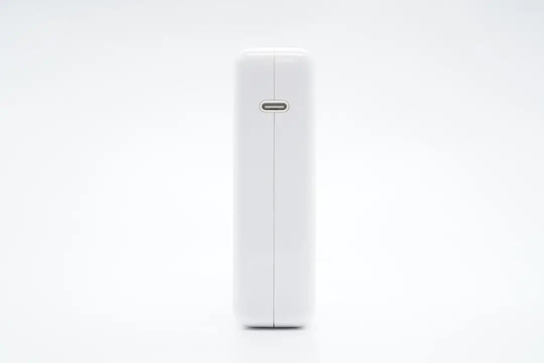 苹果这款140W氮化镓充电器延续简洁白色外壳设计,外壳高光亮面处理,边角过渡圆润。