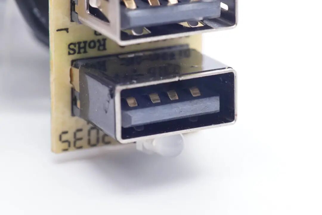 车充由绿黄两块小板组成,连接导线打胶加固。