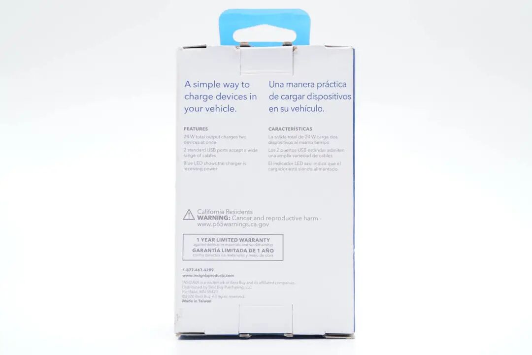 包装盒蓝白配色,正面印有INSIGNIA品牌、车充外观图以及接口功率特性标识等。
