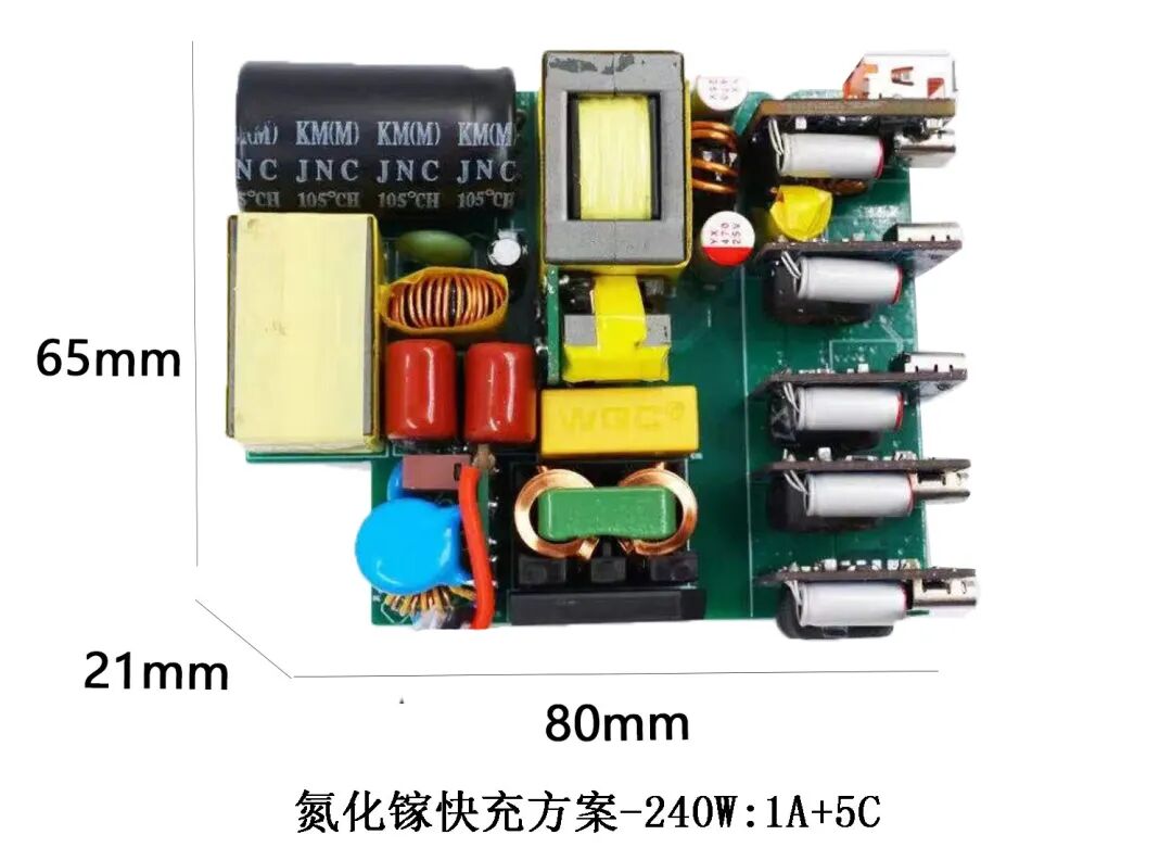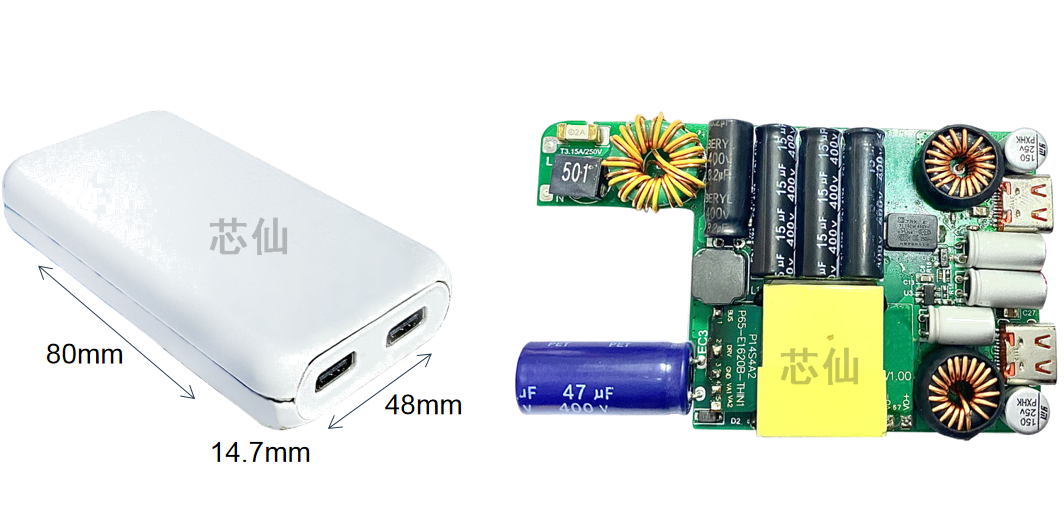 芯仙65W方案采用新品氮化镓芯方案,2C1A输出。支持功率盲插,单C口支持20V3.25A65W输出,单A口支持30W,支持双口自动分配功率,板子尺寸为48*48*20mm
