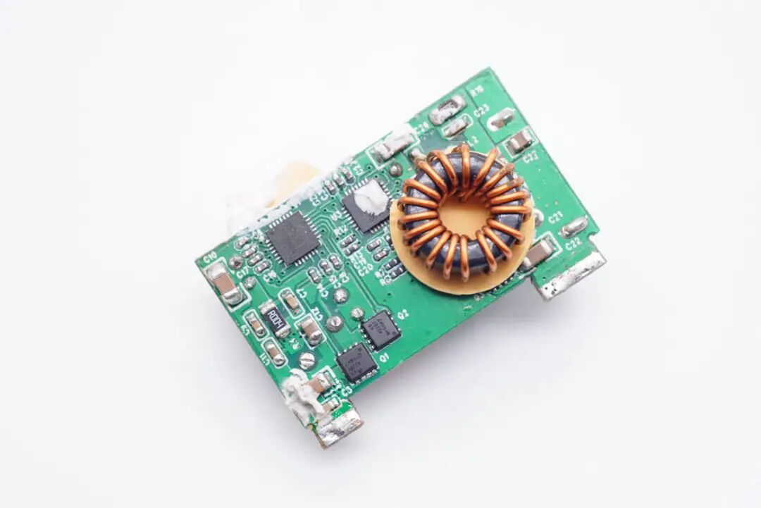 小板背面设有两颗降压协议IC、MOS管以及降压电感,电感和小板间还做了绝缘隔离处理。
