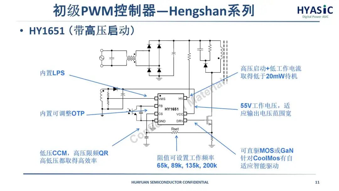华源半导体HY1651是一颗内置高压启动的主控芯片,具有待机功耗低至20mW的特点,同时支持55V工作电压,可以满足5-20V PD快充电压输出需求;可直驱MOS或GaN,针对CoolMos有自适应智能驱动;通过阻值可以设置65k/89k/135k/200k等不同频率;支持低压CCM和高压限频QR模式,内置LPS和可调整OTP等。
