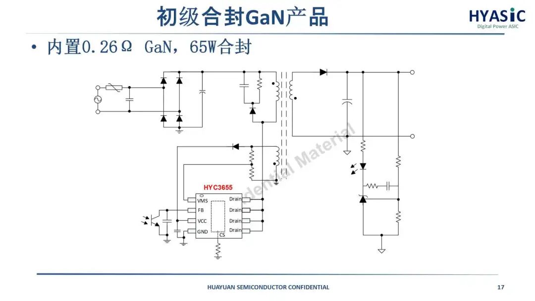 华源半导体正在研发的一款合封氮化镓芯片,内置0.26Ω氮化镓器件,支持最大65W功率,内置了Sense FET 技术,让外围电路变得更加精简。