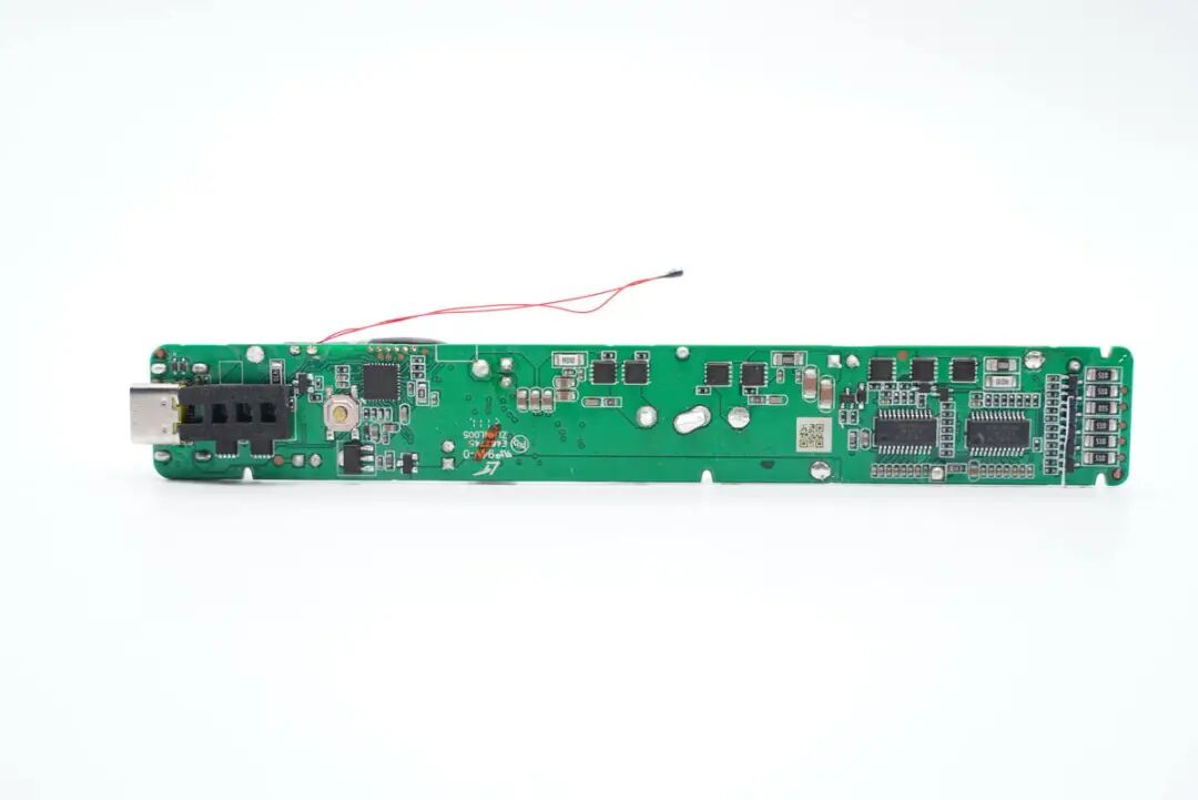 PCB板正面一览,左端设有LED灯、电源键、协议芯片等,右端设有锂电保护电路。