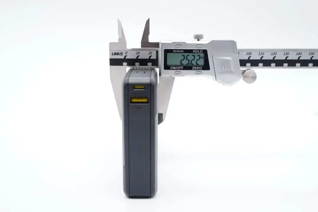 移动电源主体外壳采用PC+ABS材质,同时正背面贴有铝合金面板装饰,表面喷砂阳极氧化工艺处理。充电宝机身扁平,边角过渡圆润,在金属面板加持下,不仅手感高而且整体气质端庄。