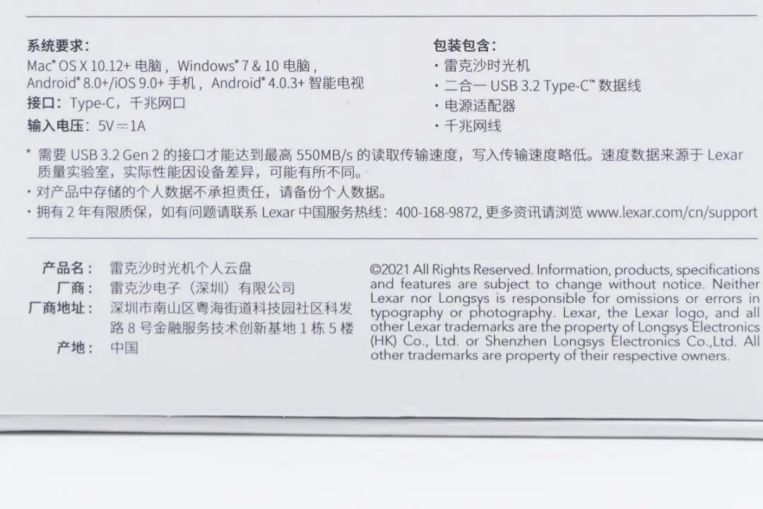 外包装印刷产品外观,这款产品的全称叫雷克沙时光机个人云盘 M2,其容量为500GB,读取速度高达550MB/S。