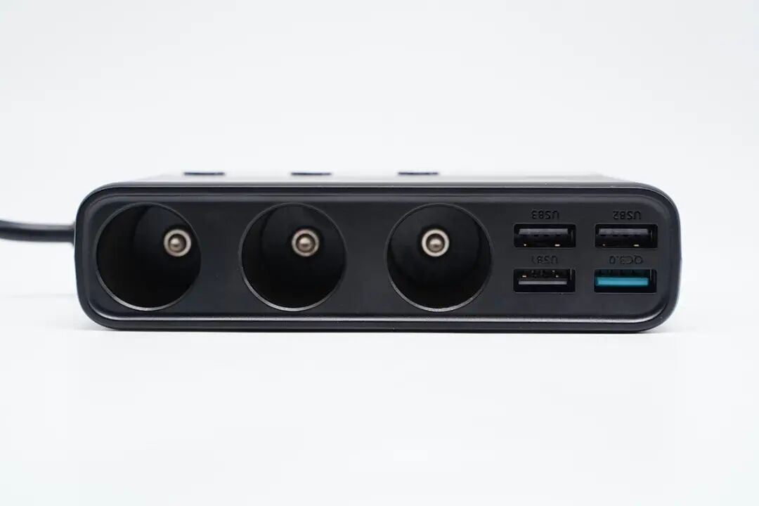 多端口汽车点烟器前端设有四个USB接口以及三个点烟器插口。