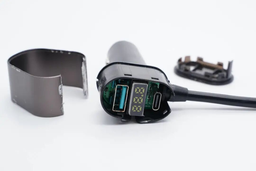 多端口汽车点烟器外壳拆开,PCB板通过螺丝、固定柱固定,三个点烟器通过金属片连接点焊加固。