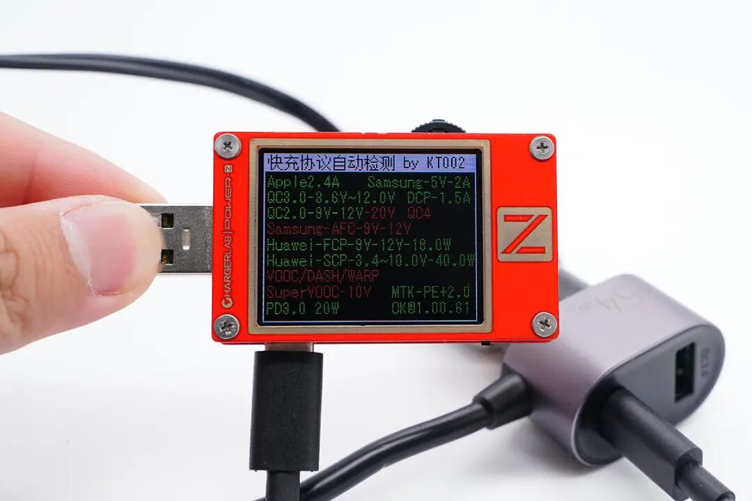 测得多端口汽车点烟器快充A口支持QC2.0/3.0、AFC、FCP快充协议。