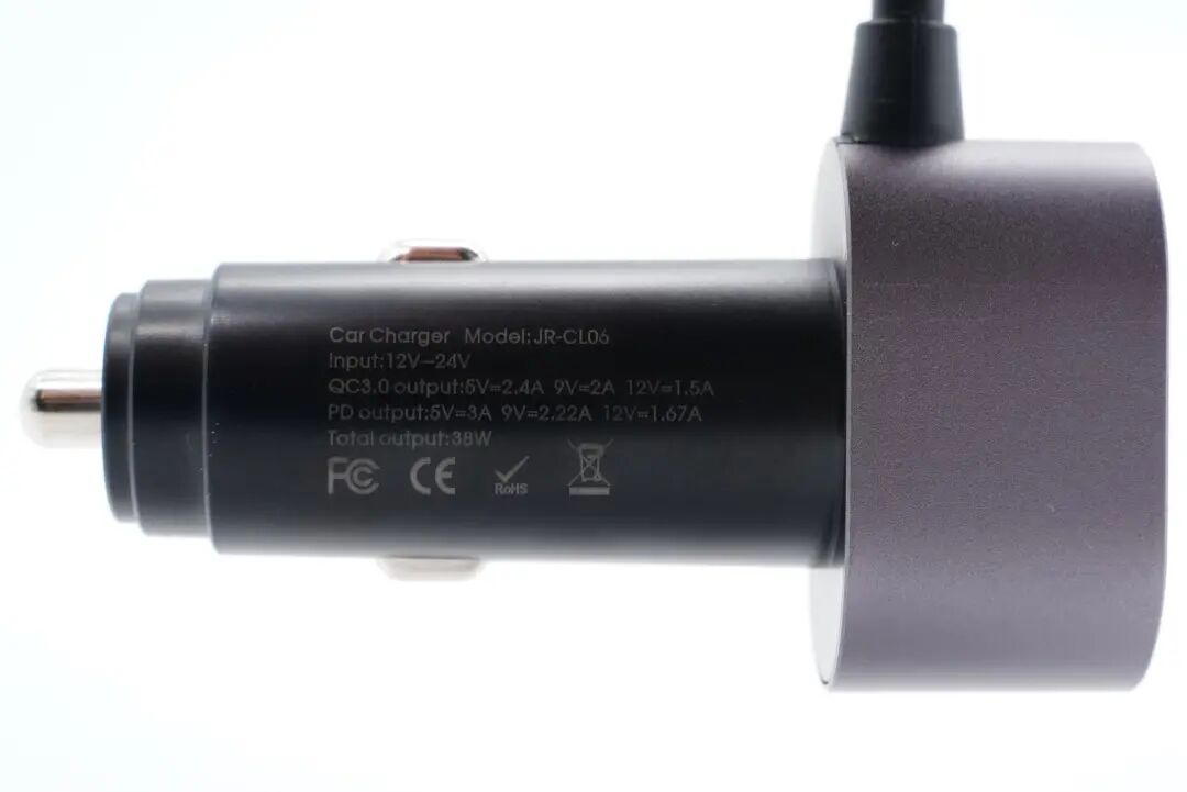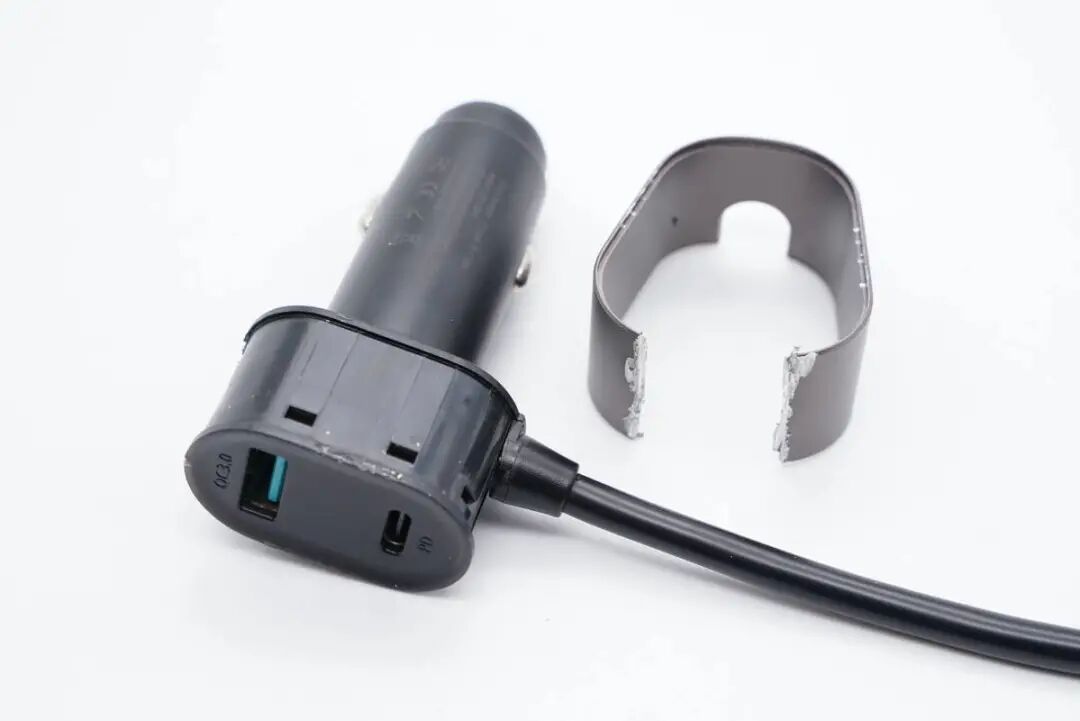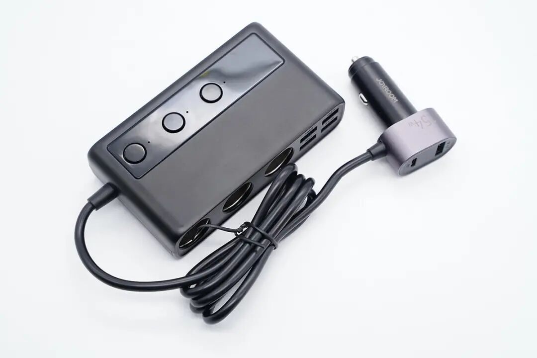 机乐堂这款多口大功率车充由车充本体、多端口汽车点烟器和连接线缆三部分组成。