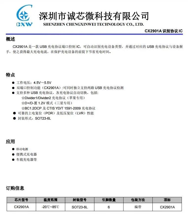 诚芯微CX2901A双路自动识别IC,用于USB-A标充口输出电压控制。这是一款USB充电协议端口控制IC,可自动识别充电设备类型,并通过对应的USB充电协议与设备握手,使之获得最大充电电流,在保护充电设备的前提下节省充电时间。