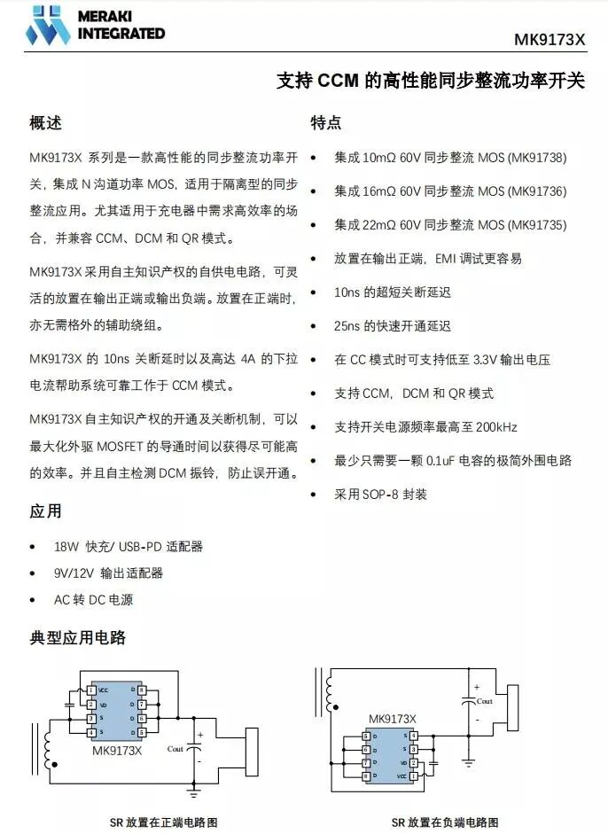 茂睿芯MK91736是茂睿芯的次级同步整流芯片,MK91736内置16mΩ同步整流管,支持200KHz开关频率。尤其适用于充电器中需求高效率的场合,并兼容CCM、DCM和QR模式。