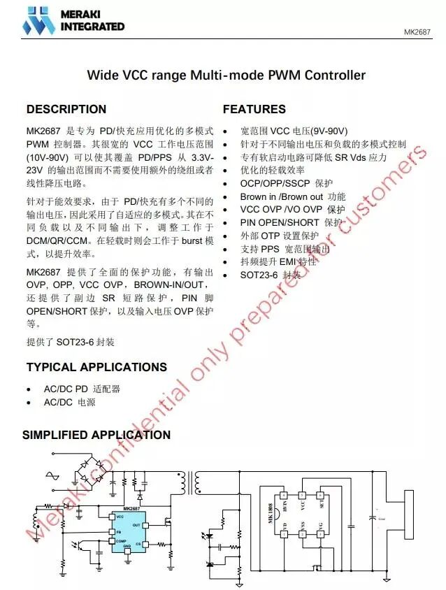 茂睿芯MK2687自主专利技术,能够显著降低开机时原副边功率管的电压尖峰,提高系统可靠性;MK2687是一款集成了多模式(CCM/DCM/QR)工作方式的PWM IC,多段式的频率曲线,有效提高系统效率。芯片推出半年来已经在多个客户实现量产。