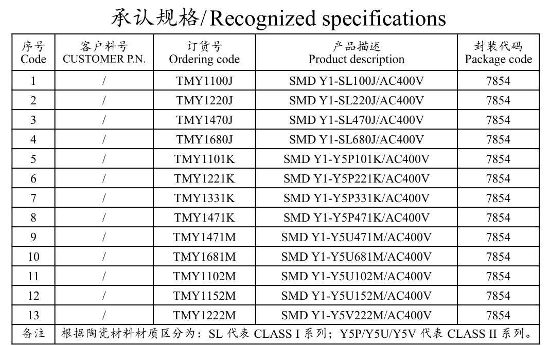 特锐祥SMD-Y1普通系列(容值2PF-2200PF,封装7854)产品选型表。