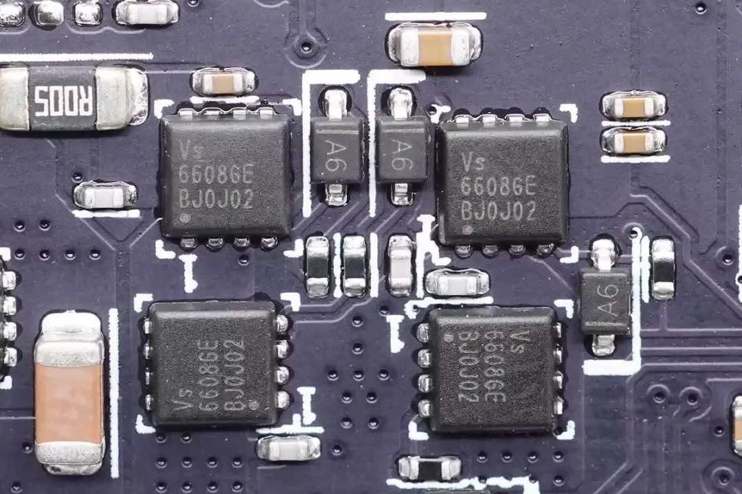 两颗输出开关管,型号VS3522AE,PMOS,39毫欧,PDFN3333封装,广泛用于各类电源、马达驱动等应用。