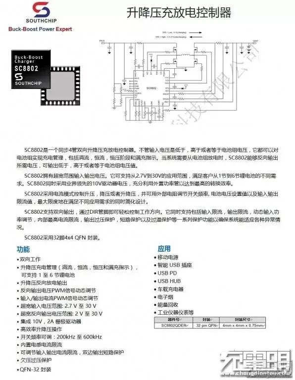 南芯SC8802拥有超宽范围输入输出电压。它可支持从2.7V到30V的应用范围,满足客户从1节到6节锂电池的不同需求。SC8802同时采用业界领先的10V驱动器电压,充分利用外置功率管以达到最高的转换效率。SC8802采用电流模式控制升压,降压或者升降压,并可用外部电阻调节开关频率, 电池电压设置值以及输入输出限流值,最大限度地在满足不同应用需求的同时简化设计。