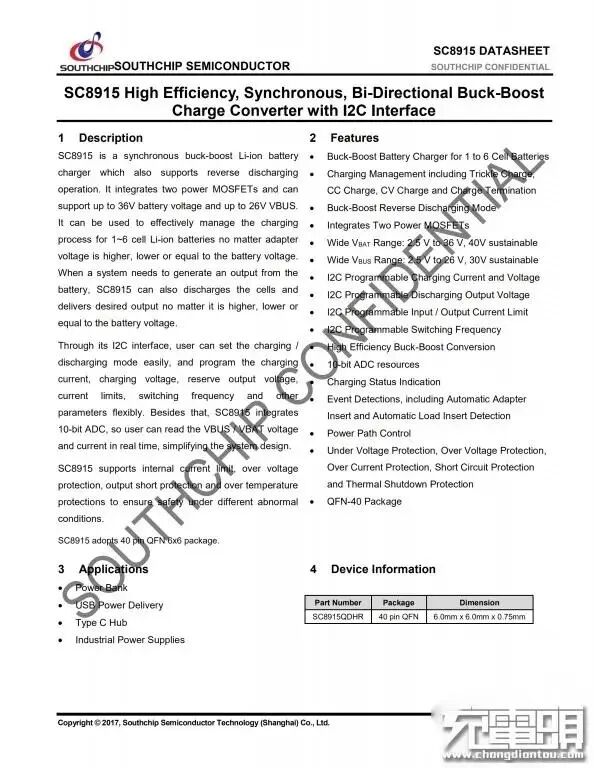 南芯SC8905拥有I2C接口,用户可以通过I2C简易快速的设定充电或者放电模式,充电电流,VINREG电压,反向放电电压,电流限流,开关频率等。充电电压及电流限流可通过外部电阻设定。SC8905支持内部电流限流,过压/欠压保护,输出短路保护以及过温保护,可以确保系统能适应各种异常情况。SC8905使用21pin 4x4 QFN封装。