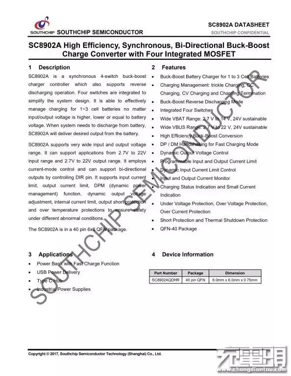 南芯SC8902A采用电流控制模式,支持超宽的2.7V至22V输入和输出电压,通过DIR pin脚的控制可轻松实现双向工作。SC8902A支持输入电流限流,输出电流限流,动态功率管理,动态输出电压调节,内部电流限流,输出短路及过温保护,保证了芯片能安全工作在各种异常情况下。SC8902A单芯片实现充电和放电功能,拥有超高的转化效率,同时支持DPDM充电握手,简化了客户的外围电路设计。SC8902A采用QFN-40 6x6封装。
