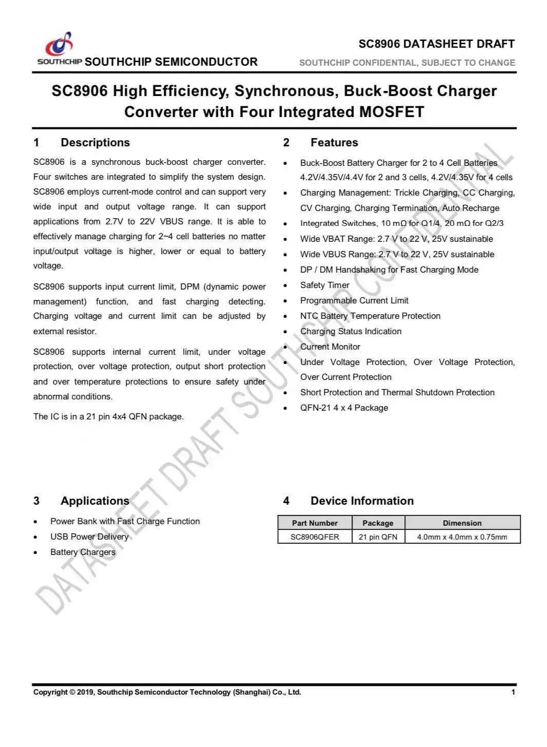南芯SC8906是一颗同步Buck-Boost充电转换器,内部集成了4颗功率管,可最大限度简化客户应用设计,减少外围BOM及PCB空间,SC8906使用电流控制模式,可支持超宽的2.7V至22V VBUS电压,无论VBUS是高于,低于或是等于电池电压,SC8905可有效管理2节至4节电池的充电。