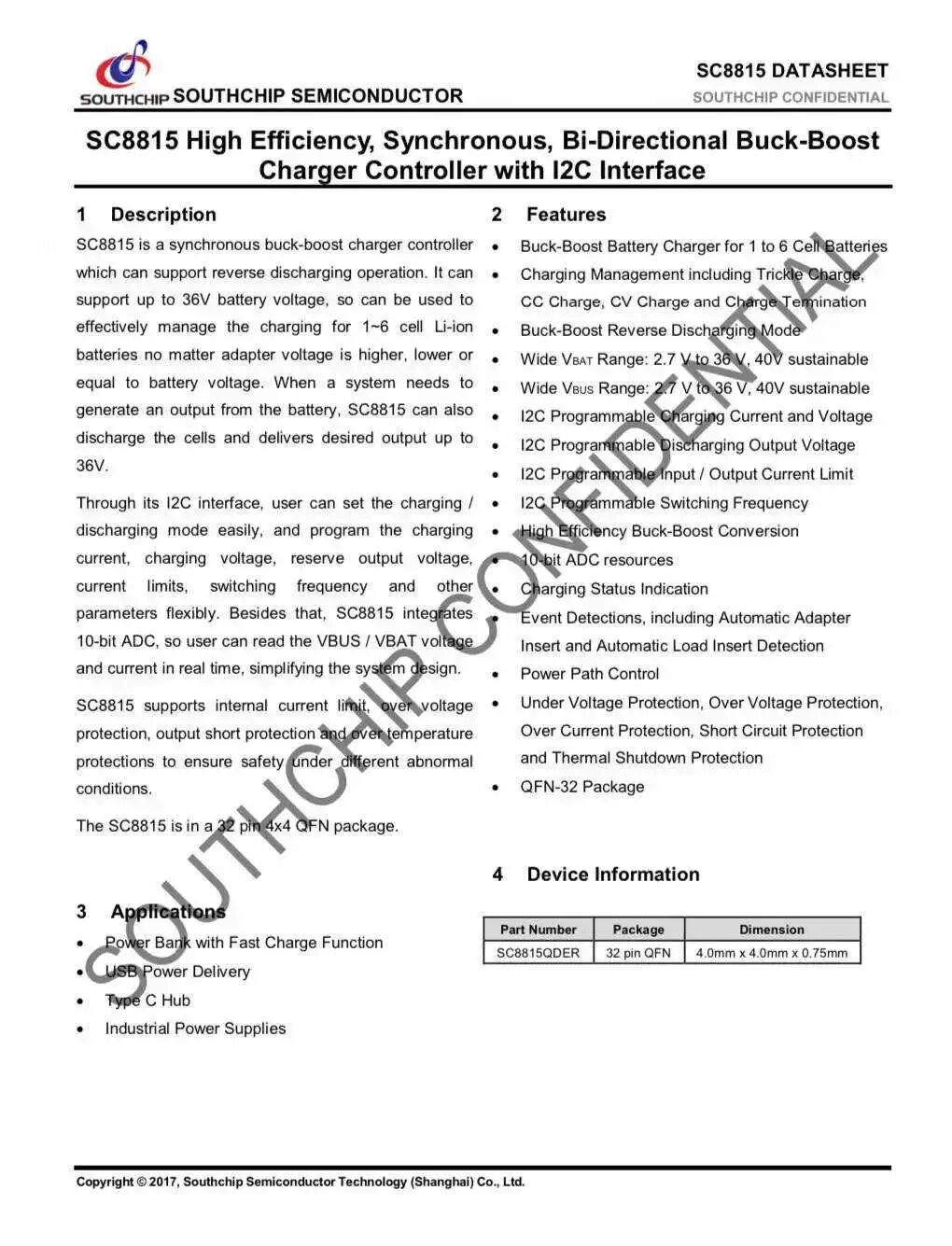 SC8815内部集成的10位ADC,可以方便用户实时检测读取VBUS/VBAT电压和电流,另外,SC8815还可以支持适配器和设备的插拔检测,最大限度的减少外围电路及PCB Space,使系统设计极大地简化。SC8815支持内部限流保护、过压保护、输出短路保护和过温保护,从而保证了各种异常情况下的安全。SC8815提供32脚的4x4 QFN封装。