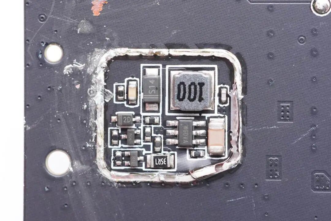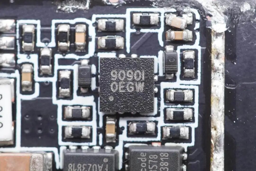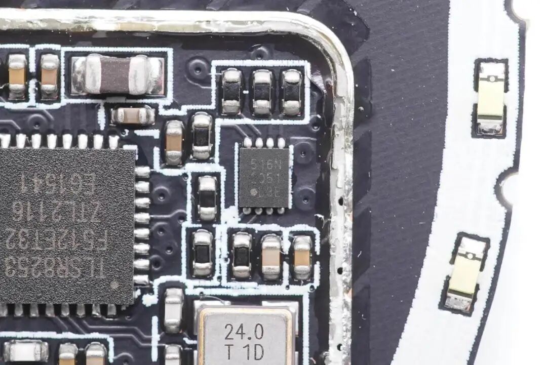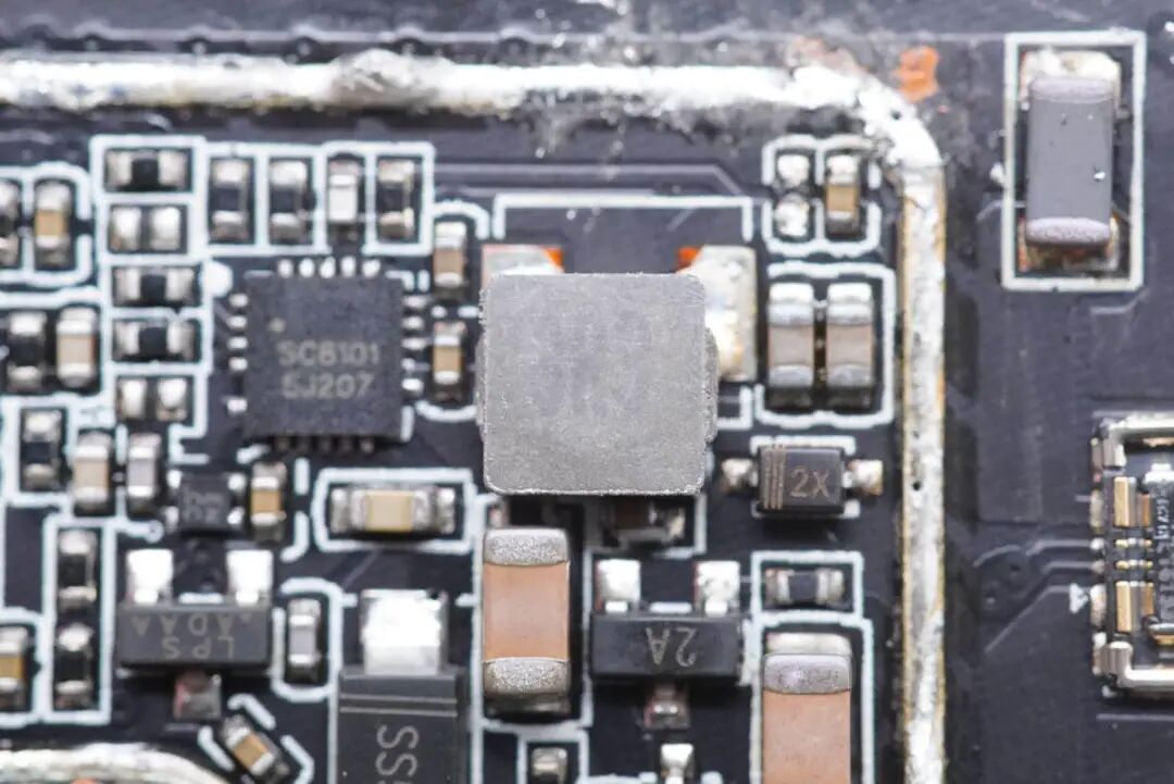 板子右上角的屏蔽罩内设有无线充电主控芯片、驱动器以及线圈驱动MOS管。