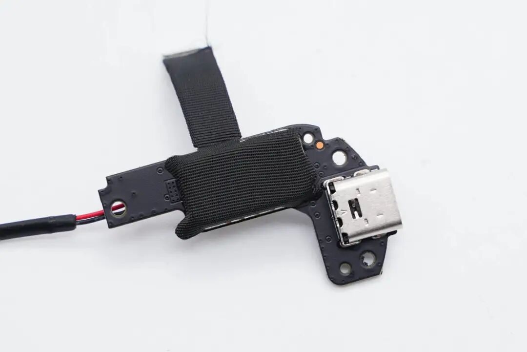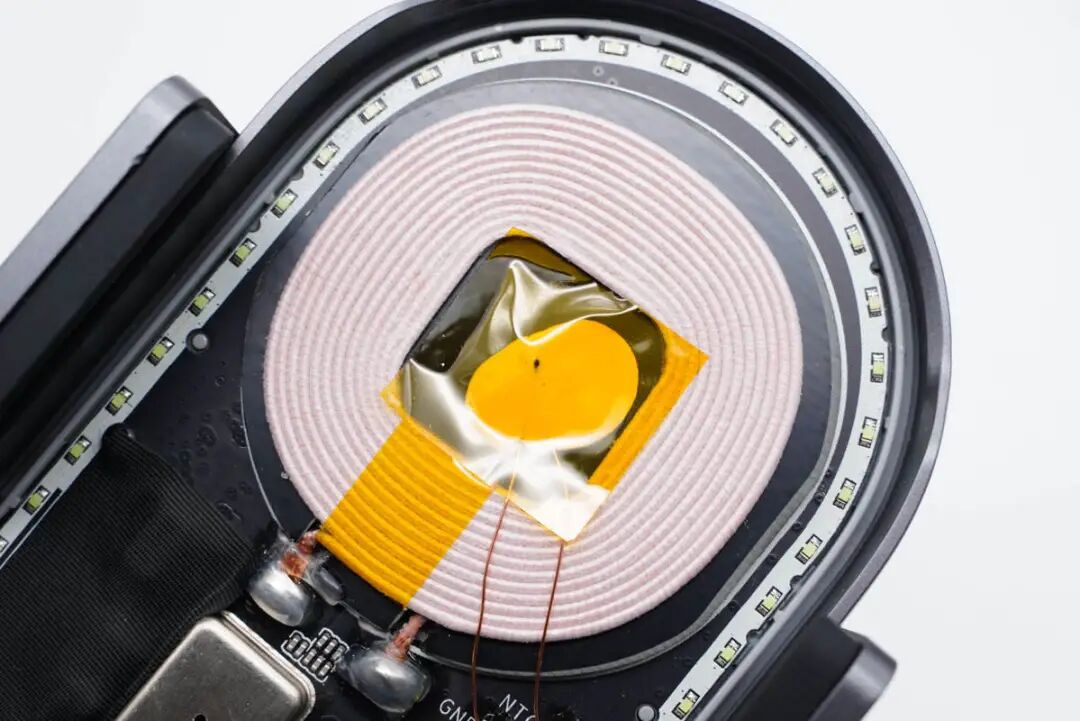 此外还焊接无线充电线圈和热敏电阻,热敏电阻打胶以及粘贴胶带固定在线圈中心处。
