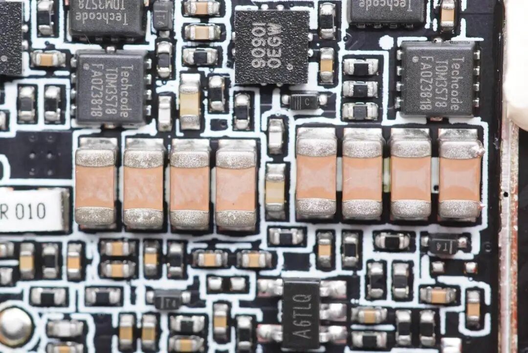 主板两个小屏蔽罩内各设有一路降压电路,这一路设有两颗六脚芯片和电感。