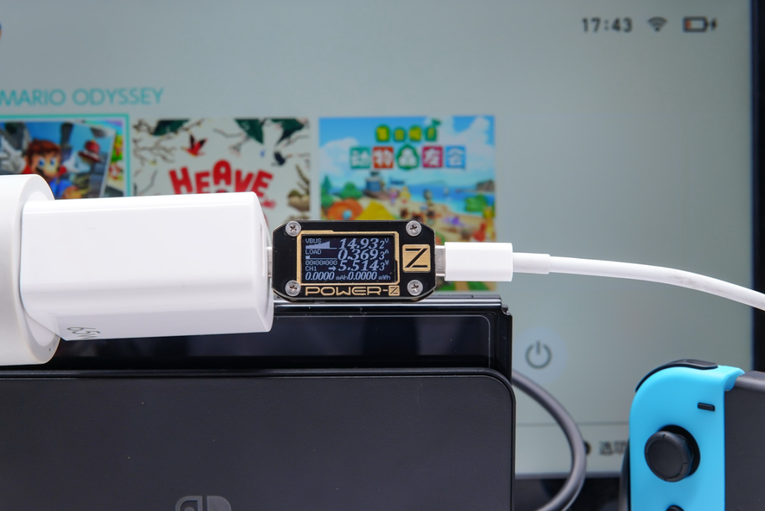 古石65W 1A1C充电器USB-C输出口对Switch底座充电,功率为14.93V 0.36A 5.51W,顺利开启TV模式。