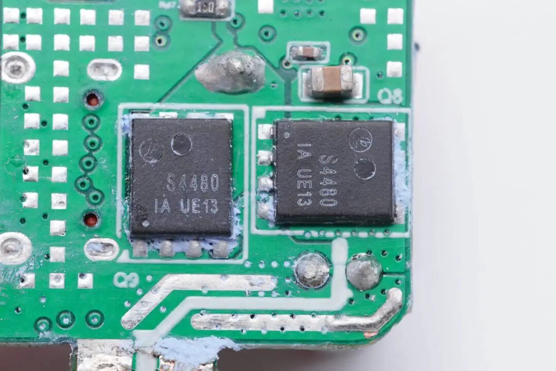 背面器件就有区别了,其中C1和C2口的相同,设有两颗降压输出MOS管,降压协议IC在正面电感下,上图展示正面时被电感挡住了才没看见。