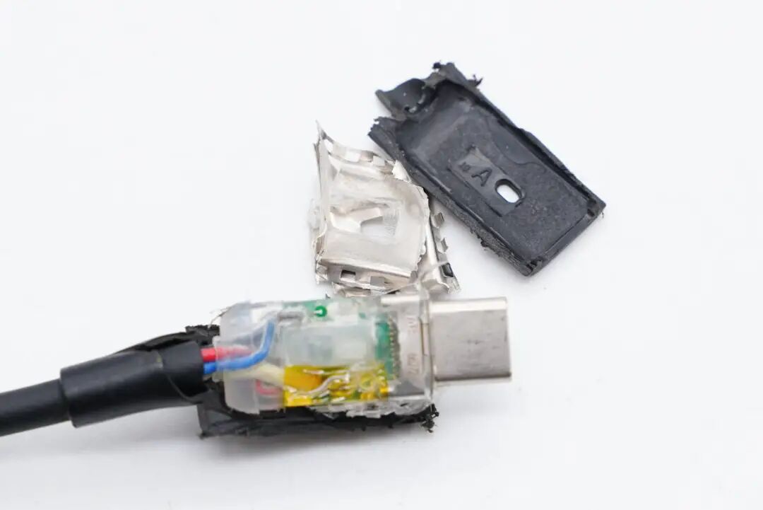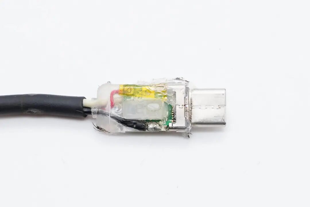 整个转接头像一条短数据线,整体黑色,线身上带有参数标签。