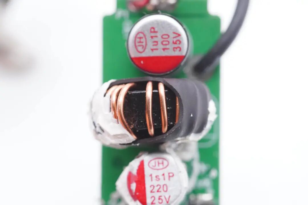 PCB板正面设有输入输出滤波电容以及降压电感,打胶加固。
