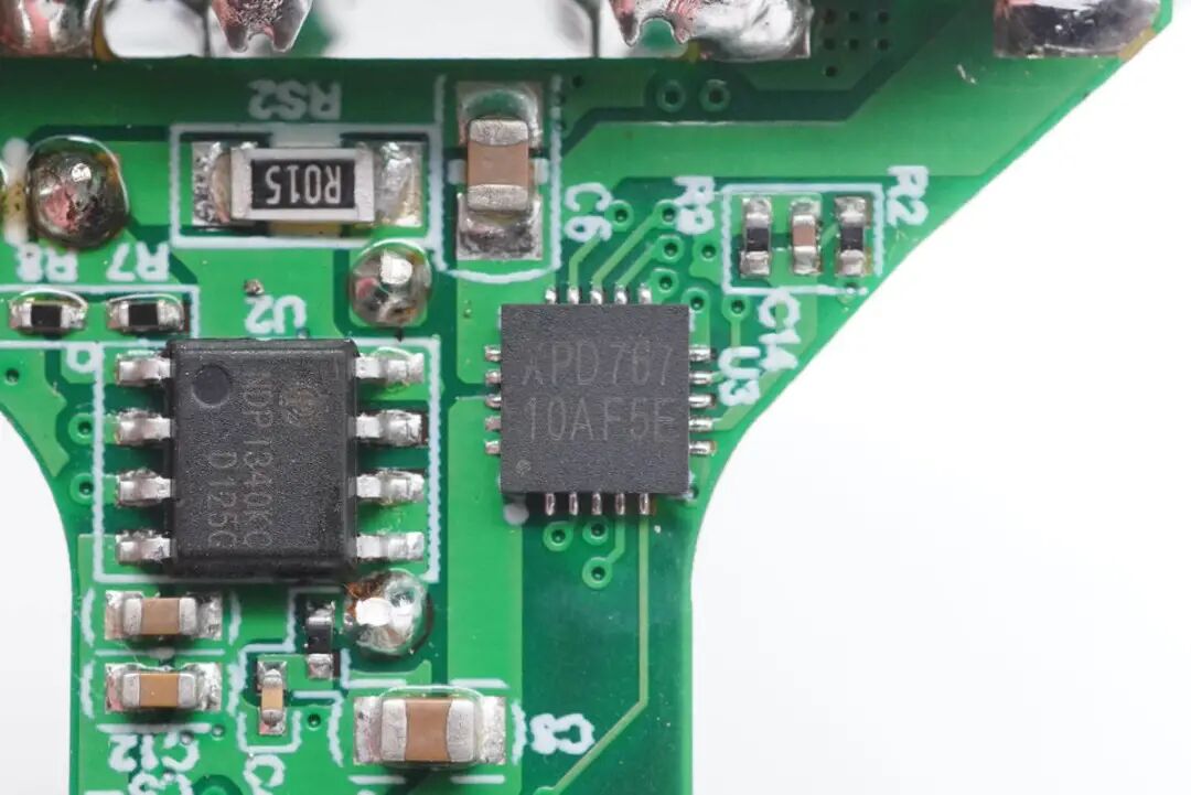 协议芯片采用云矽半导体XPD767,控制1A1C接口输出电压。这款芯片已经通过了USB PD3.0认证,TID:3479。支持QC2.0/3.0/3.0+、AFC、FCP、SCP、HVSCP、PD和PPS等快充协议,内部集成 10mΩ VBUS 通路功率开关管,并且集成10mΩ电流检测电阻,支持完善的保护功能,节省外围元件数量,简化电路,降低成本。支持TSSOP-20和QFN20封装。