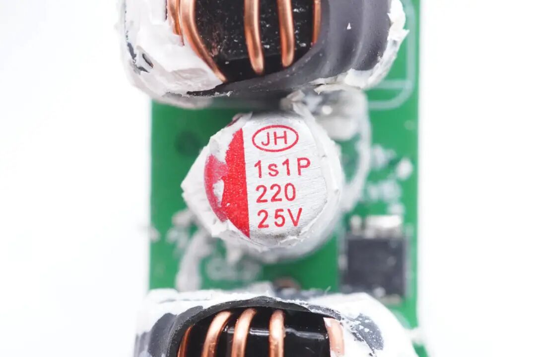 另一颗固态电容也是来自江海,规格为25V 220μF,用于降压输出滤波。