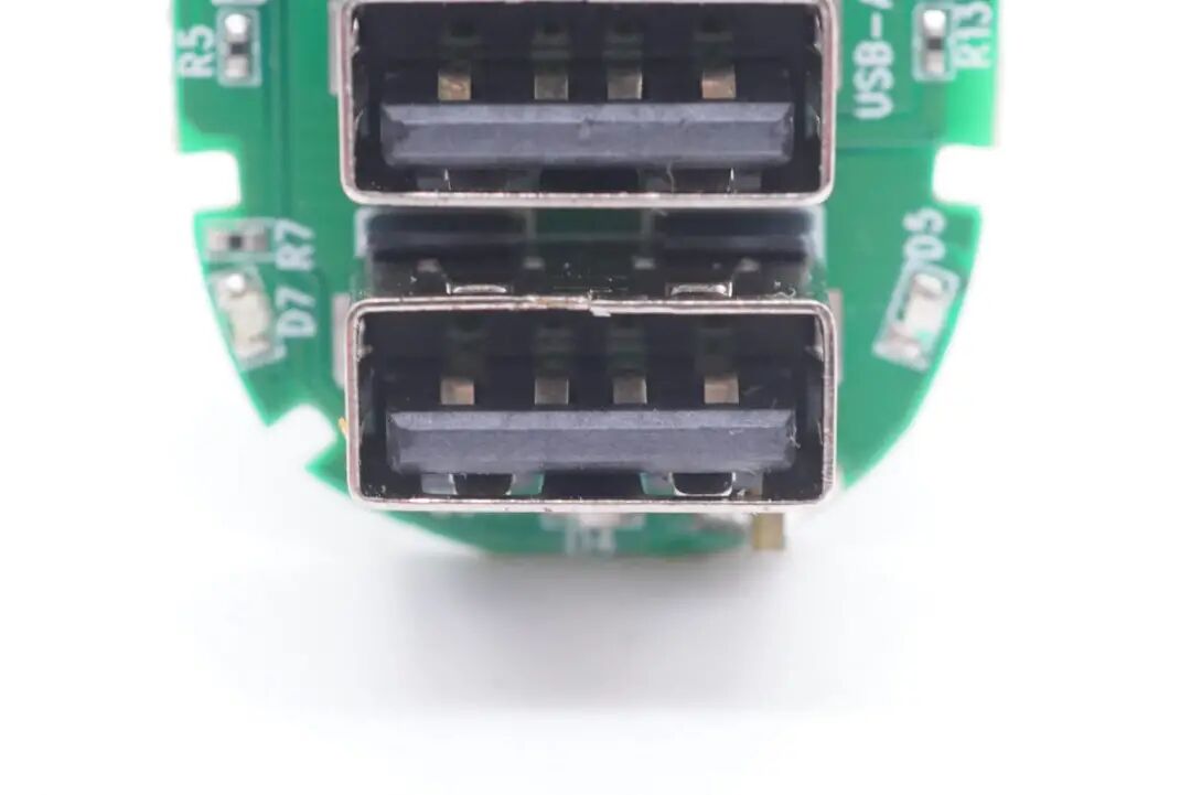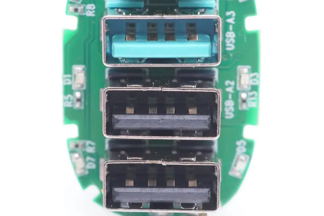 USB-A母座特写,采用蓝色胶芯方便区别。
