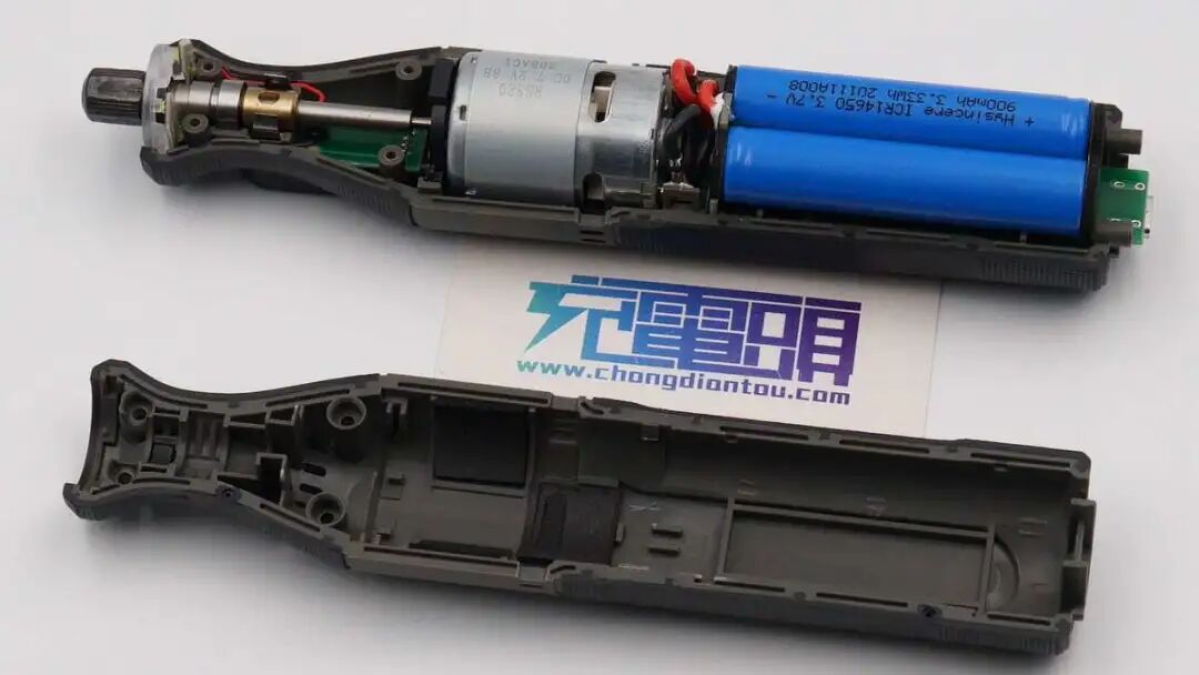 电磨机内部布局一览,依次是电池、电机、转轴,电机前端设有黑色塑料板加固。