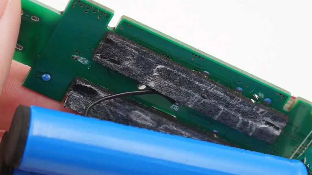 电池与PCB之间有泡棉粘贴固定和保护,PCB板背面没有元器件。