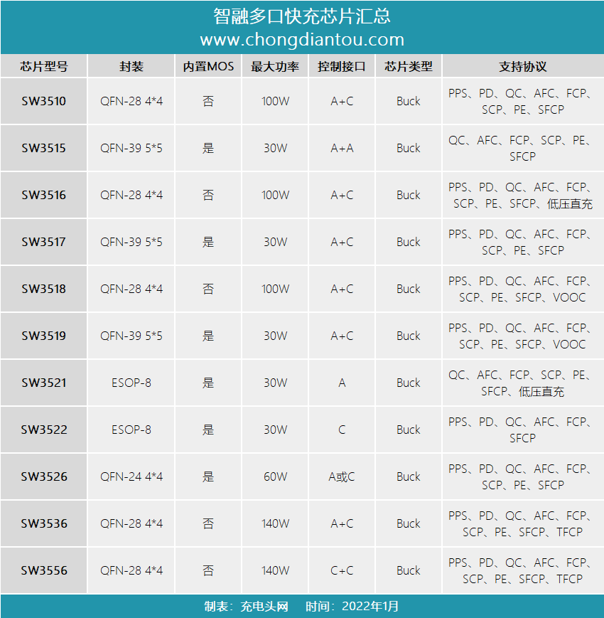 针对30W快充应用,智融推出了SW3515、SW3517、SW3519、SW3521、SW3522四款芯片,其中SW3515、SW3517以及SW351可以满足1A1C或者双A口快充设计需求,SW3521和SW3522则是专门针对单一接口输出的芯片,性价比极高。