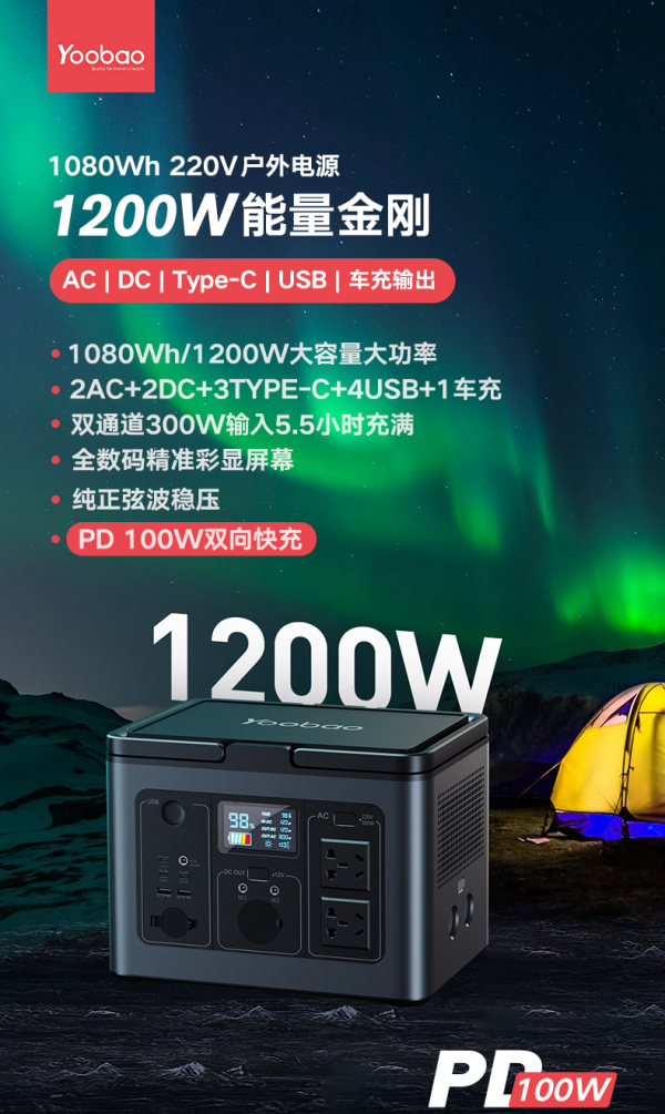 羽博 EN1200P 拥有 1080Wh 超大容量电力储备,配备了 3C2A USB 直流输出接口,支持 100W PD快充输出,能直接对手机、平板、笔记本提供大功率快充支持。带有两个正弦波交流电输出接口,最大输出功率 1200W,与家用市电拥有相同的兼容性,可以驱动市面上绝大部分电器运行,支持 100W DC + 200W 航空口双通道同时输入,最高功率达300W,仅需 4 小时即可充满自身,快速满血恢复续航性能。
