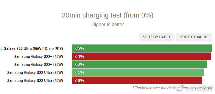 在前面已经提过,三星Galaxy S22系列共有两种快充性能配置,分别是支持45W超级加速充电的S22 Ulrta、S22+、支持25W超级加速充电的S22。据外媒Gsmarena测试,三星45W、25W充电器虽然功率上接近翻倍,实际充入速度差距并不大,30分钟充入电量均在60%左右,45W主要是短时峰值功率会大一点,长时间后充电功率与25W接近。
