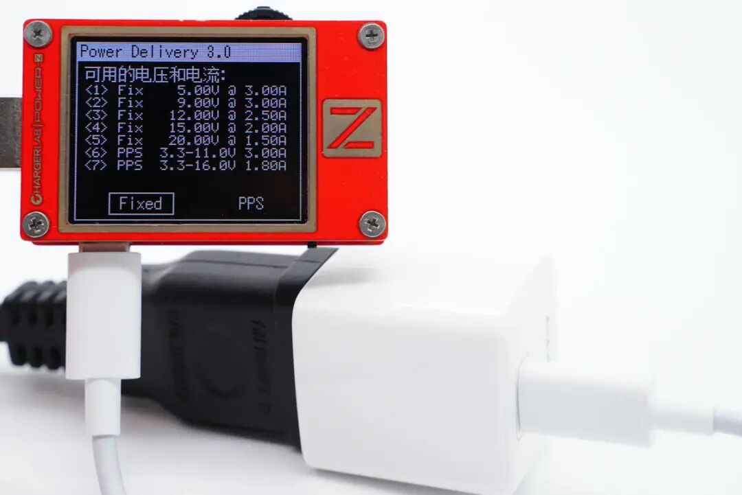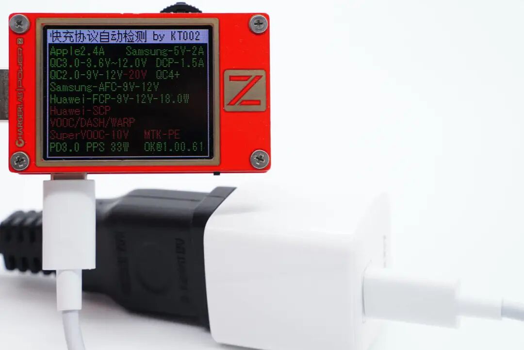 使用ChargerLAB POWER-Z KT002测得这款充电器支持Apple 2.4A、Samsung 5V2A、DCP协议,以及QC2.0/3.0、AFC、FCP、PD3.0、PPS快充协议。